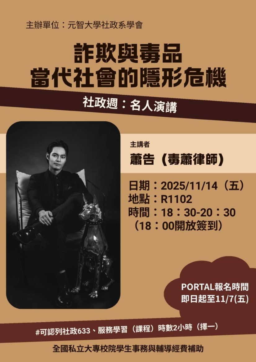 ★★★參加11/14名人演講活動可認列服務學習課程時數2小時、社政系職涯發展633(二擇一) ★★★服務學習課程請於活動結束後兩週內填寫服務學習日誌~(逾期將不給予成績)