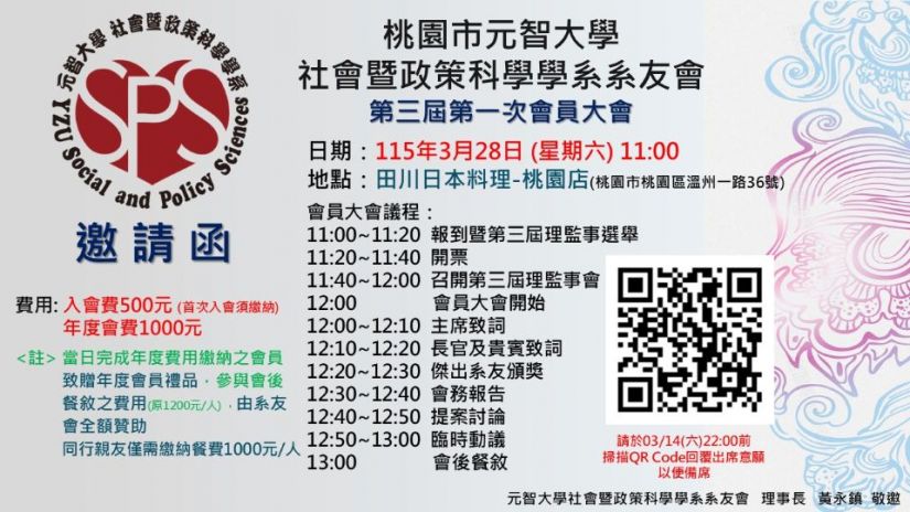 元智大學社會暨政策科學學系第三屆第一次會員大會訂於115年3月28日。地點:桃園田川日本料理