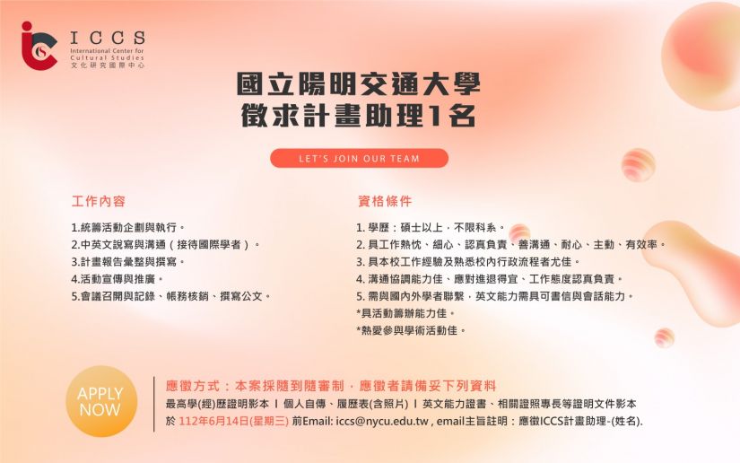 國立陽明交通大學 文化研究國際中心徵求計畫助理1名
