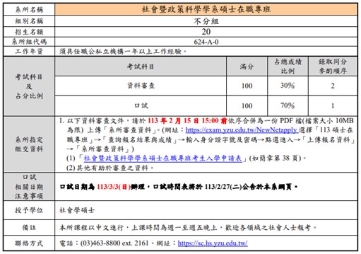 (網址:https://www.yzu.edu.tw/admissions/index.php/tw/yan-jiu-suo-zhao-sheng/shuo-shi-zai-zhi-zhuan-ban/792-yuan-zhi-da-xue113xue-nian-du-shuo-shi-zai-zhi-zhuan-ban-zhao-sheng-jian-zhang-gong-gao)