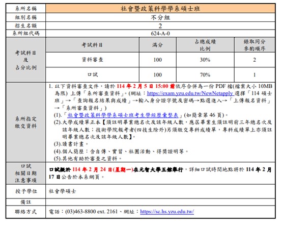 (網址:https://www.yzu.edu.tw/admissions/index.php/tw/yan-jiu-suo-zhao-sheng/shuo-shi-ban)