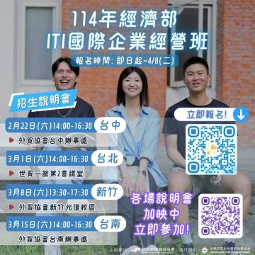辦理之「114年度ITI國際企業經營班(國企班)」招生開跑!報名至4月8日止!詳細資訊請連結網頁查詢: